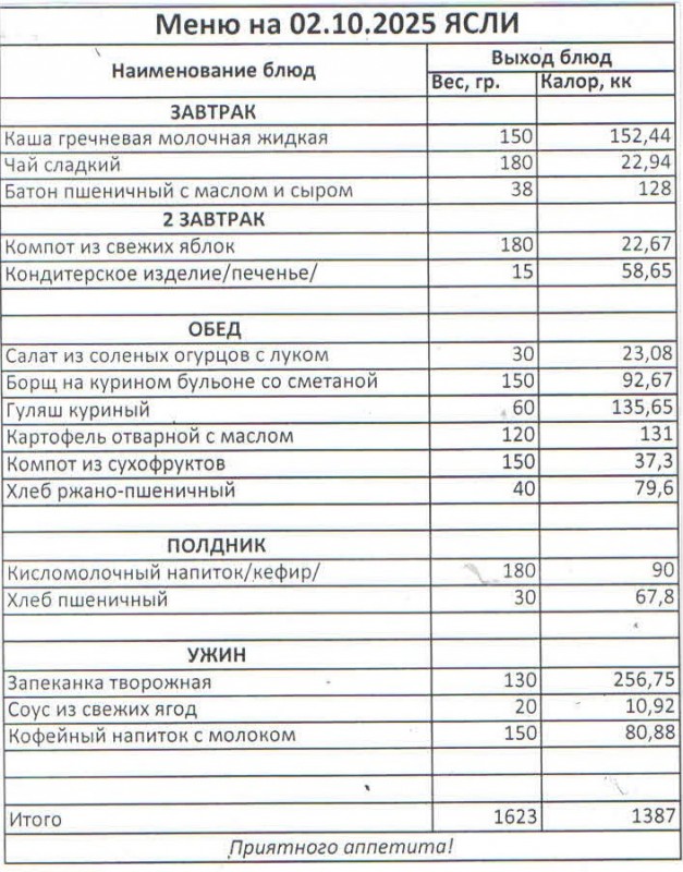 Меню на 02.10.2025 (ясли)