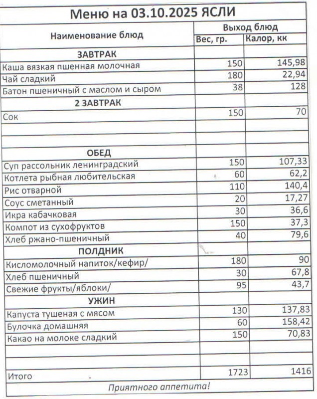 Меню на 3.10.2025 (ясли)