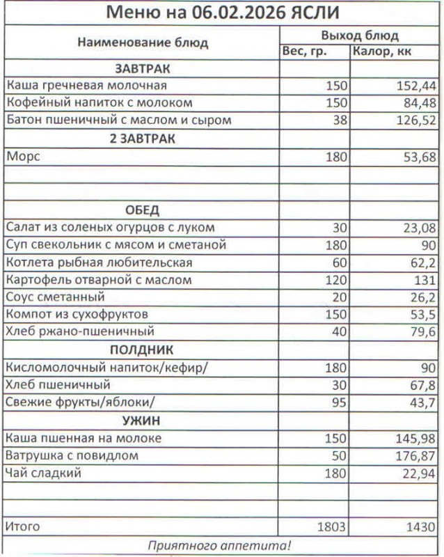 Меню на 06.02.2026 (ясли)