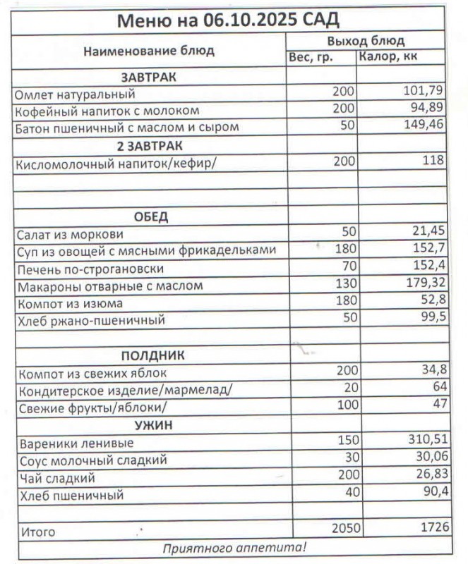 Меню на 06.10.2025 ( сад)