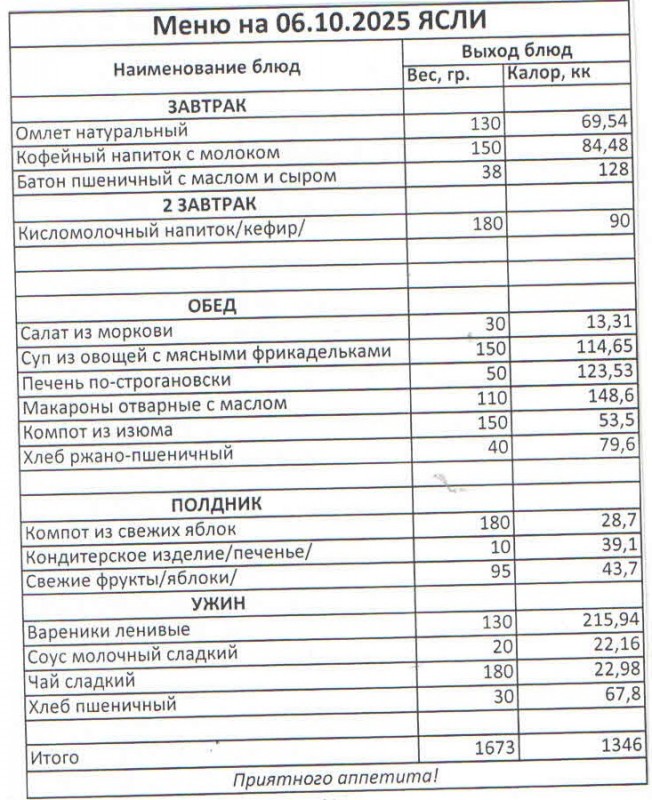 Меню на 06.10.2025 (ясли)