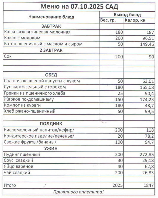 Меню на 07.10.2025 (сад)