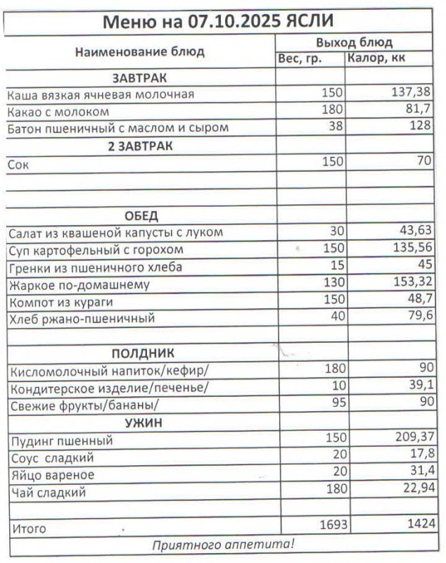 Меню на 07.10.2025 (ясли)
