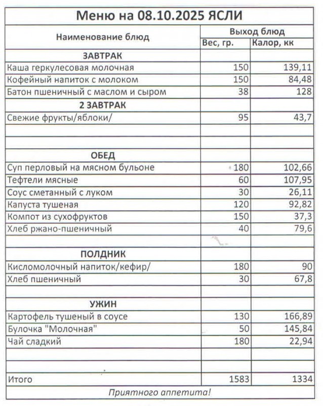 Меню на 08.10.2025 (ясли)