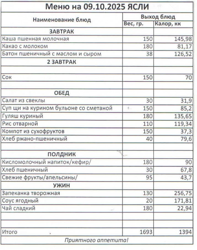 Меню на 09.10.2025 (ясли)