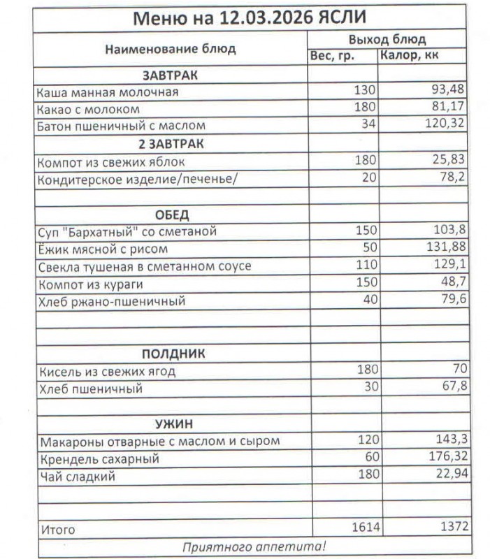 Меню на 12.03.2026 (ясли)