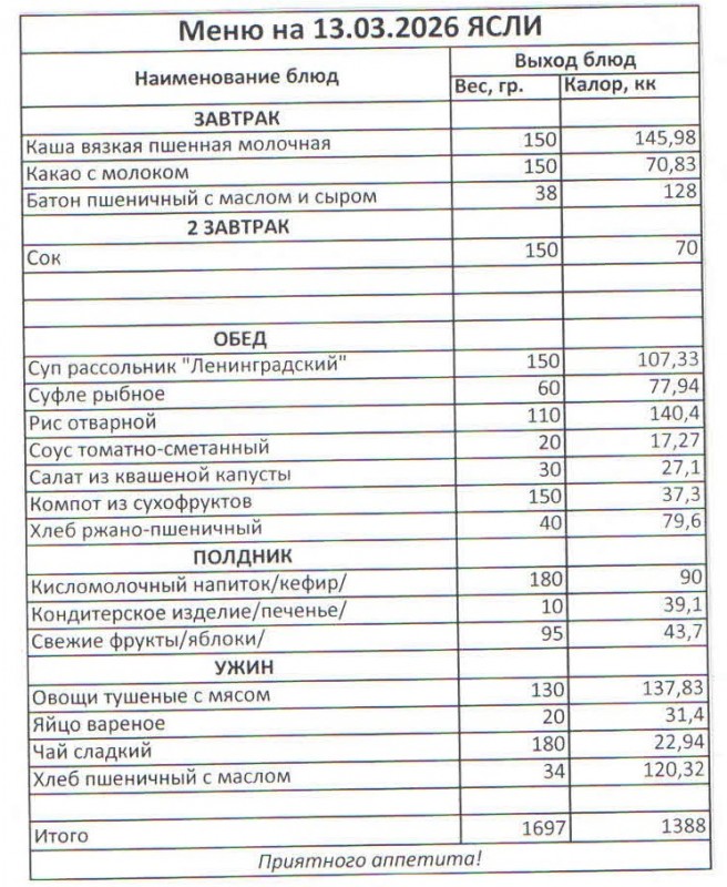 Меню на 13.03.2026 (ясли)
