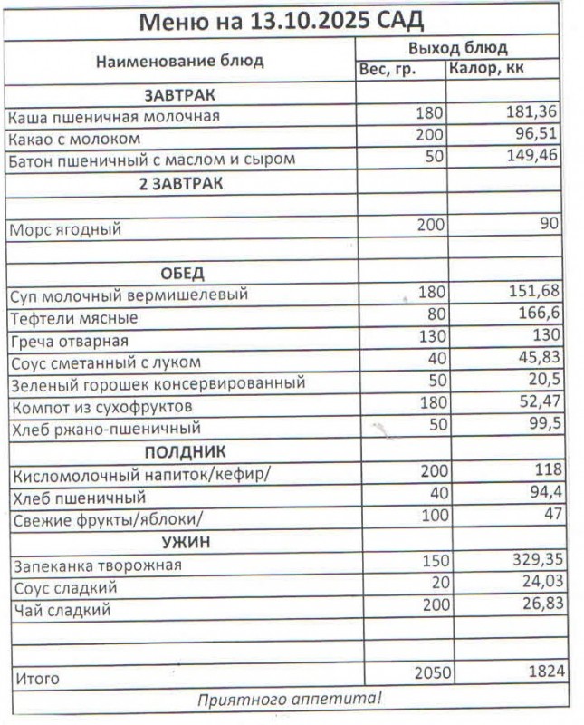 Меню на 13.10.2025г. (сад)