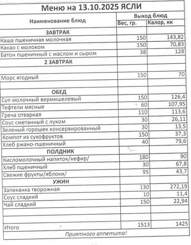 Меню на 13.10.2025 г. (ясли)