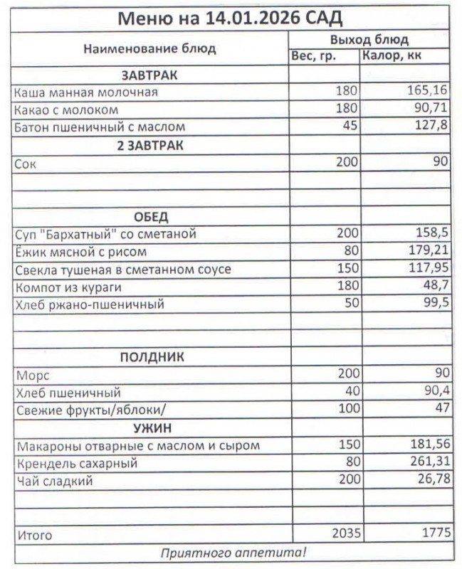 Меню на 14.01.2026 (сад)