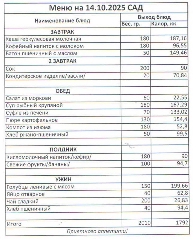 Меню на 14.10.2025 г. (сад)