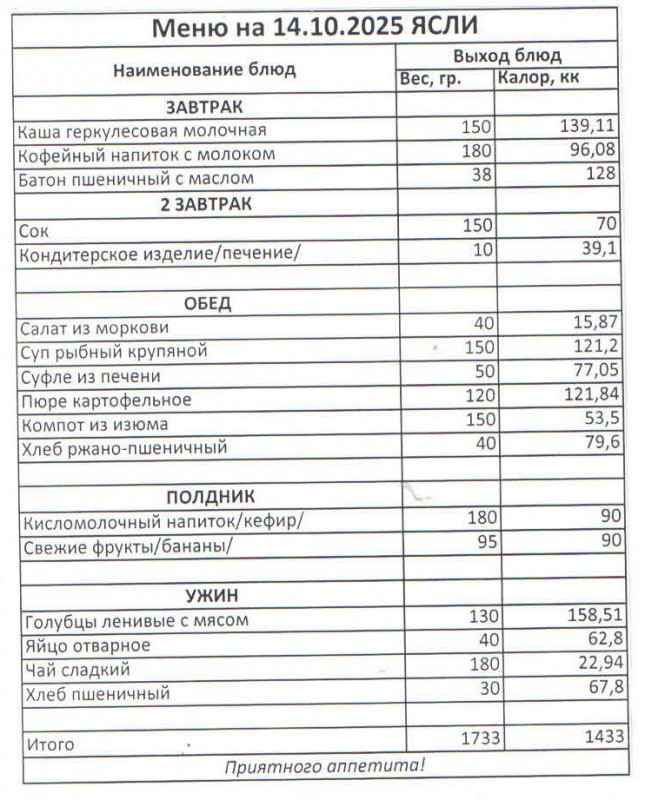 Меню на 14.10.2025 г.(ясли)