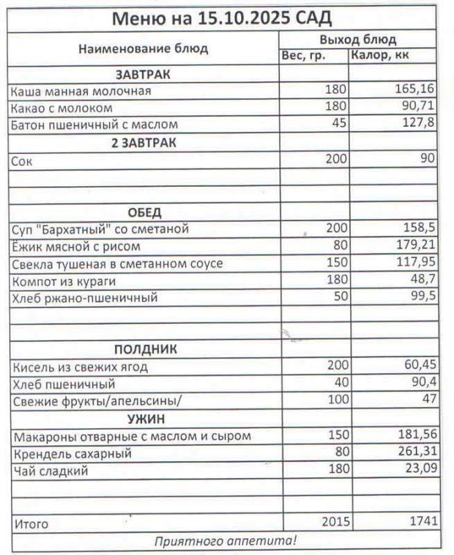 Меню на 15.10.2025 г. (сад)