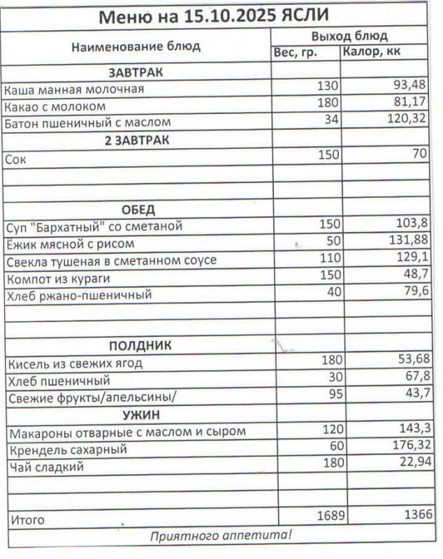 Меню на 15.09.2025 ясли