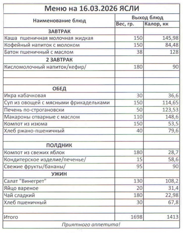 Меню на 16.03.2026 (ясли)