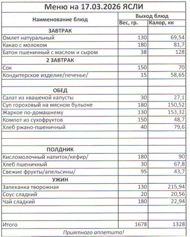 Меню на 17.03.2026 (ясли)