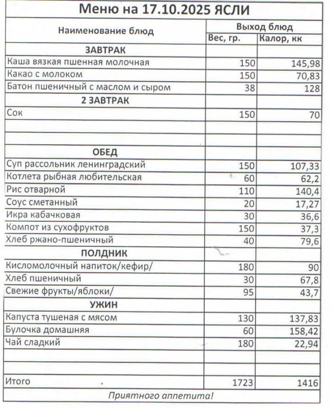Меню на 17.10.2025 (ясли)