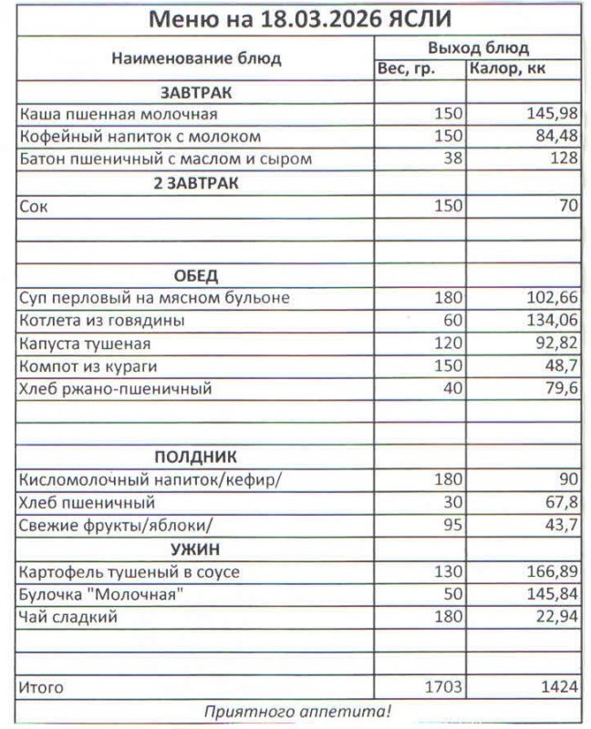Меню на 18.03.2026 (ясли)