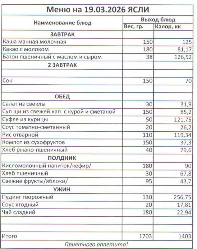 Меню на 19.03.2026 (ясли)