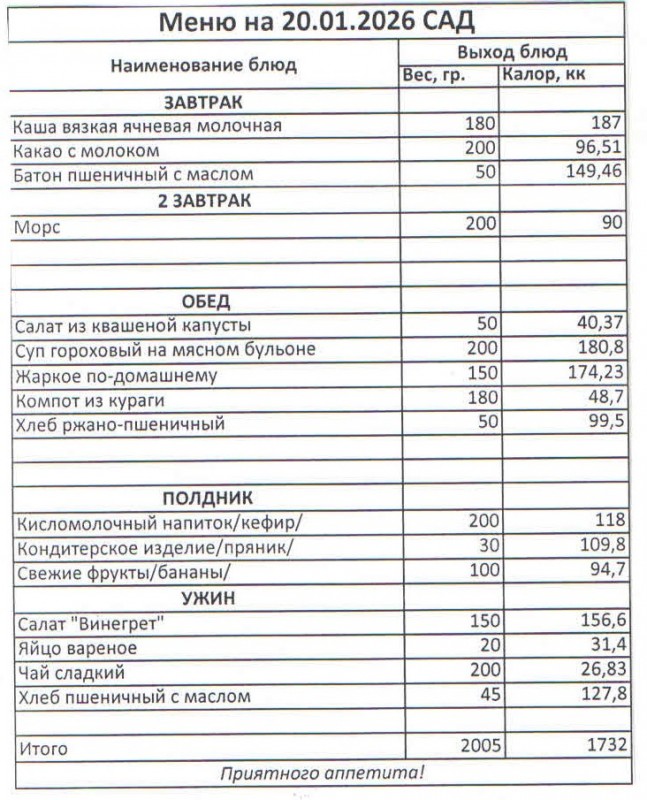 Меню на 20.01.2026 (сад)