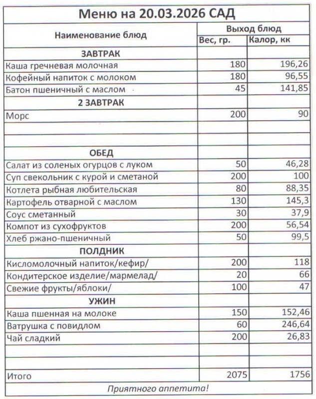 Меню на 20.03.2026 (сад)