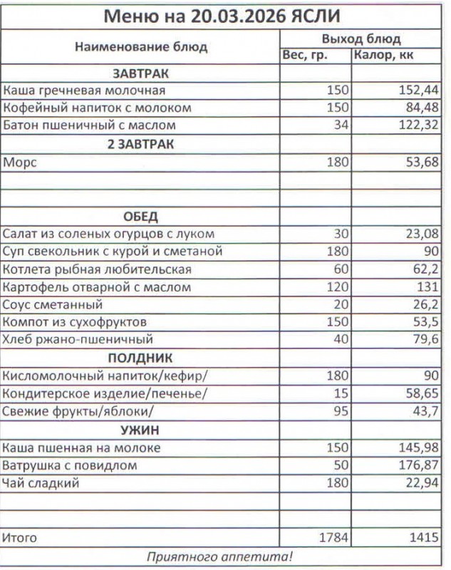 Меню на 20.03.2026 (ясли)
