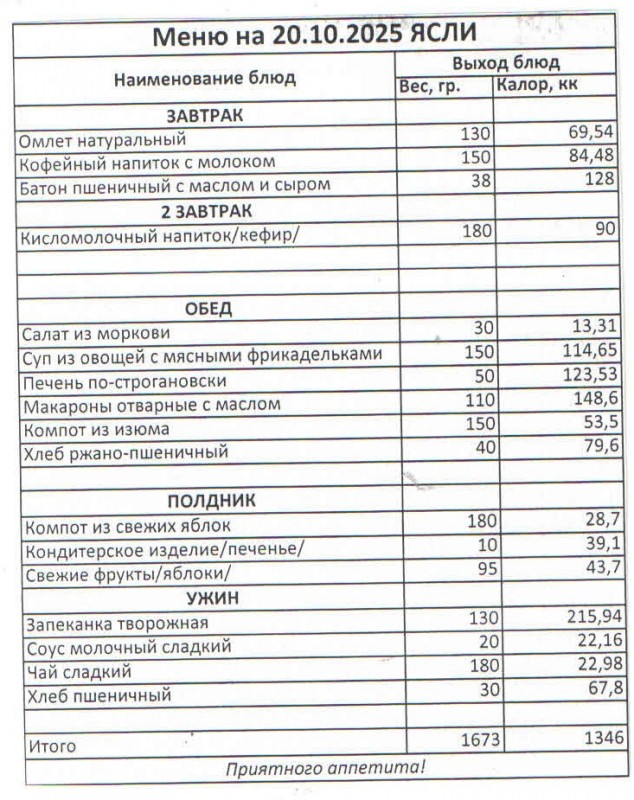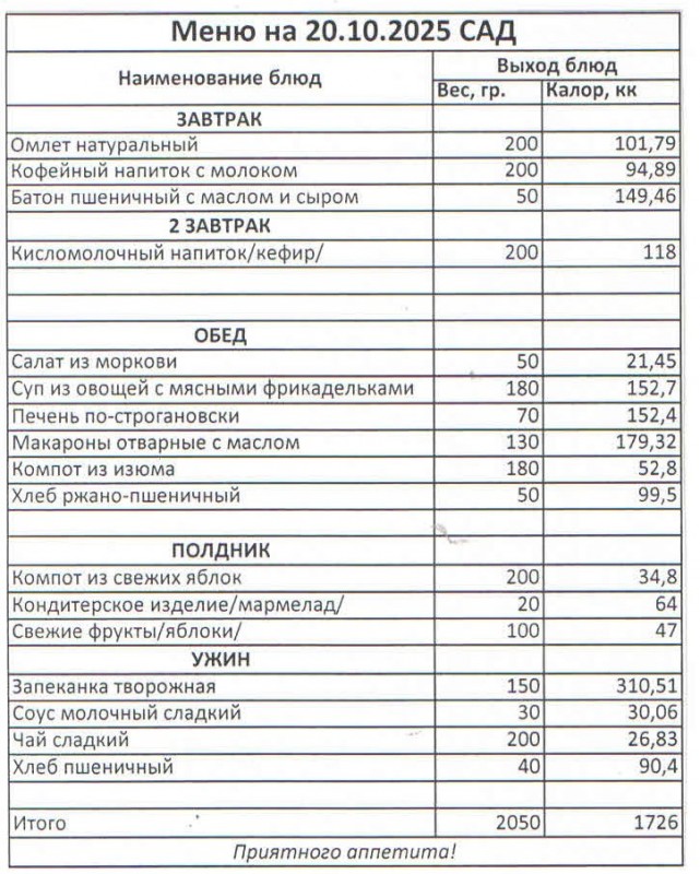 Меню на 20.10.2025 (сад)