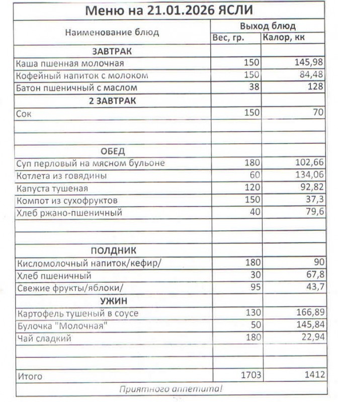 Меню на 21.01.2026 (ясли)