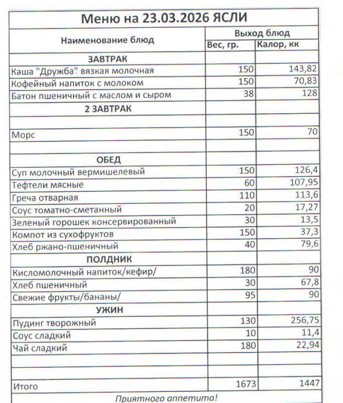 Меню на 23.03.2026 (ясли)