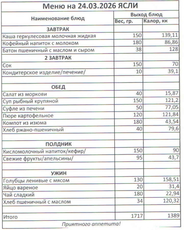 Меню на 24.03.2026 (ясли)