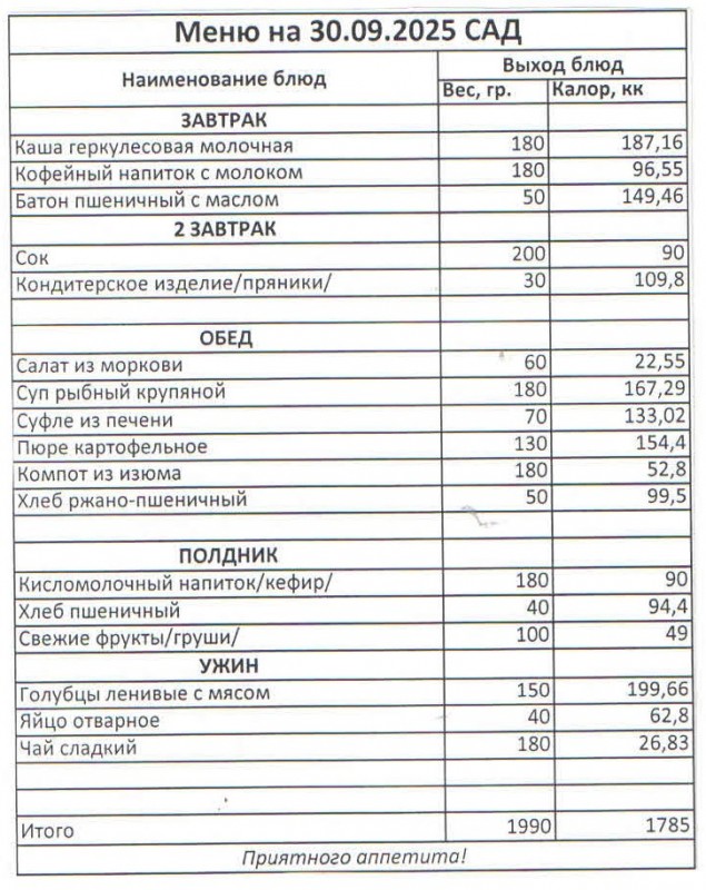 Меню на 30.09.2025 (сад)