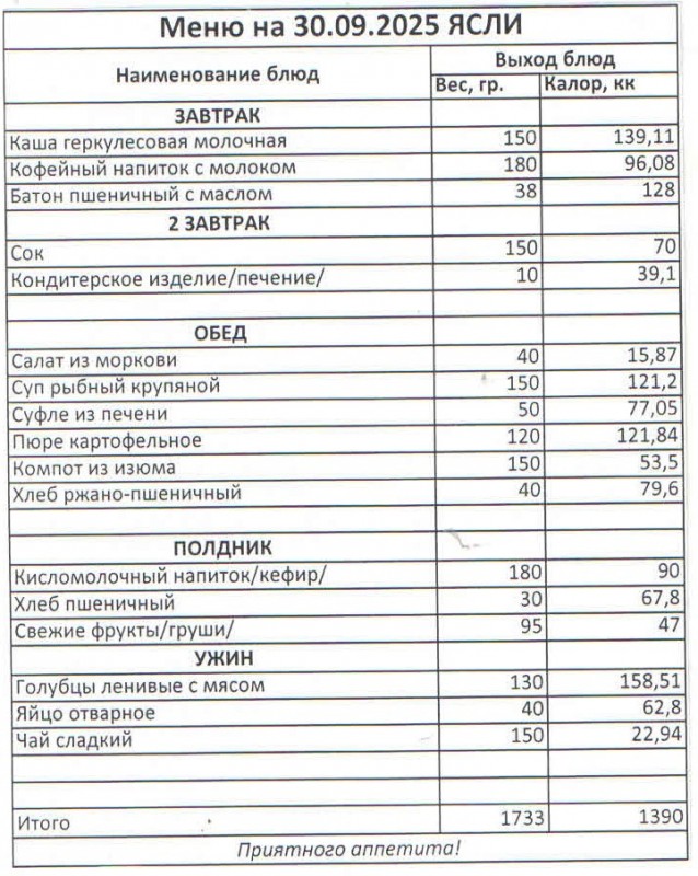 Меню на 30.09.2025 (ясли)