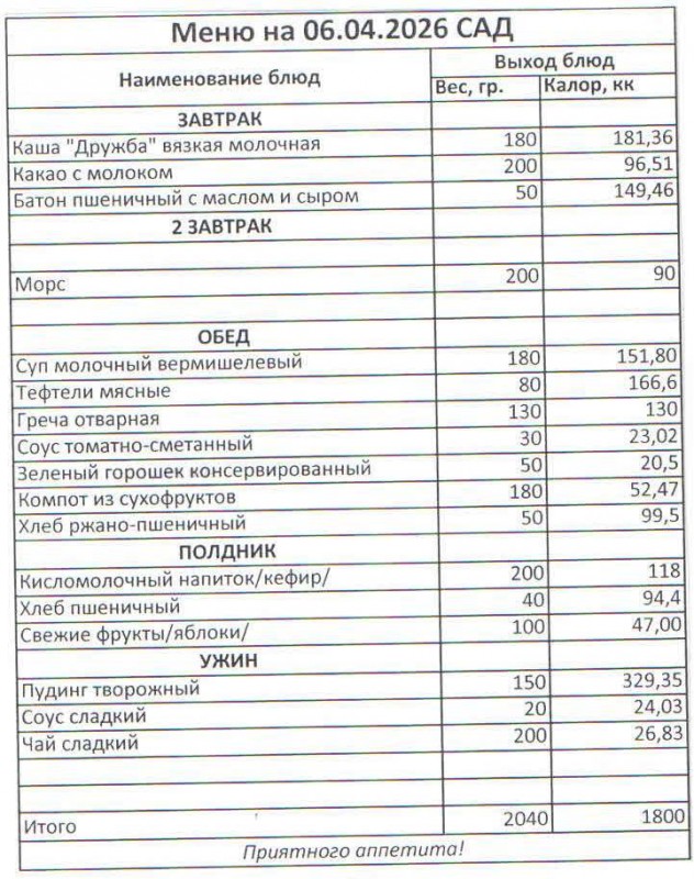 Меню на 06.04.2026 (сад)