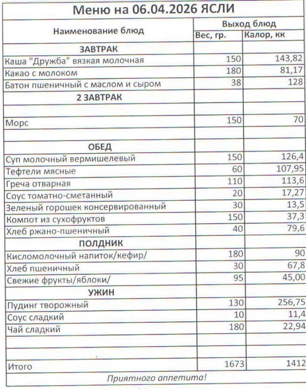 Меню на 06.04.2026 (ясли)