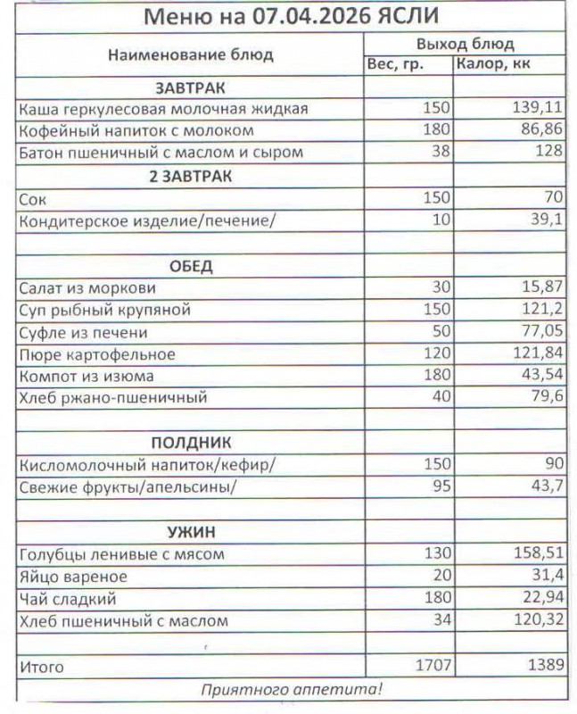 Меню на 07.04.2026 (ясли)