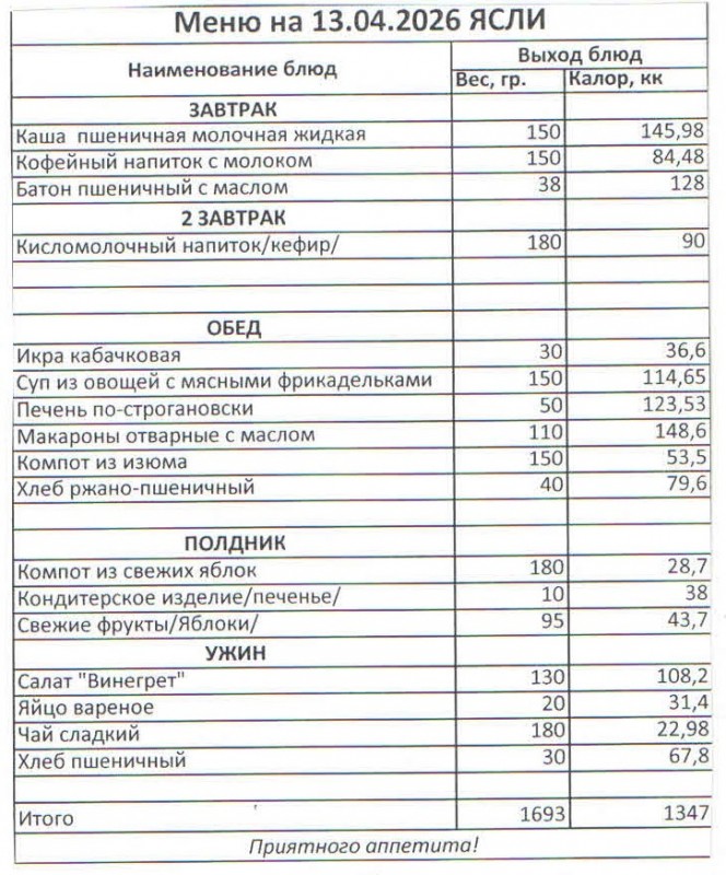 Меню на 13.04.2026 (ясли)
