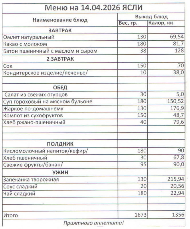 Меню на 14.04.2026 (ясли)