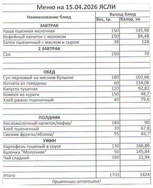 Меню на 15.04.2026 (ясли)