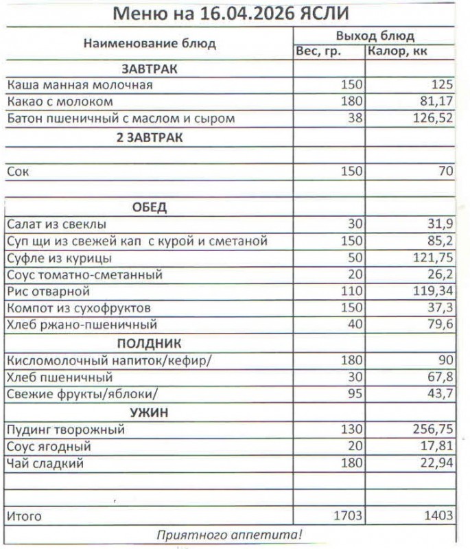 Меню на 16.04.2026 (ясли)