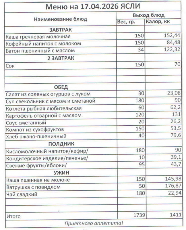 Меню на 17.04.2026 (ясли)