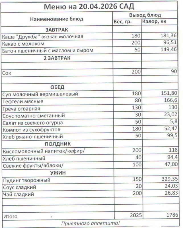 Меню на 20.04.2026 (сад)