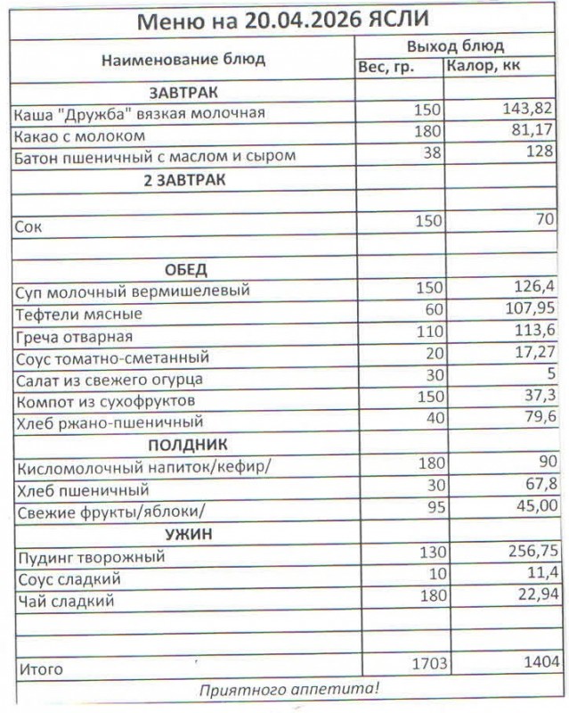 Меню на 20.04.2026 (ясли)