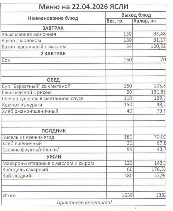 Меню на 22.04.2026 (ясли)