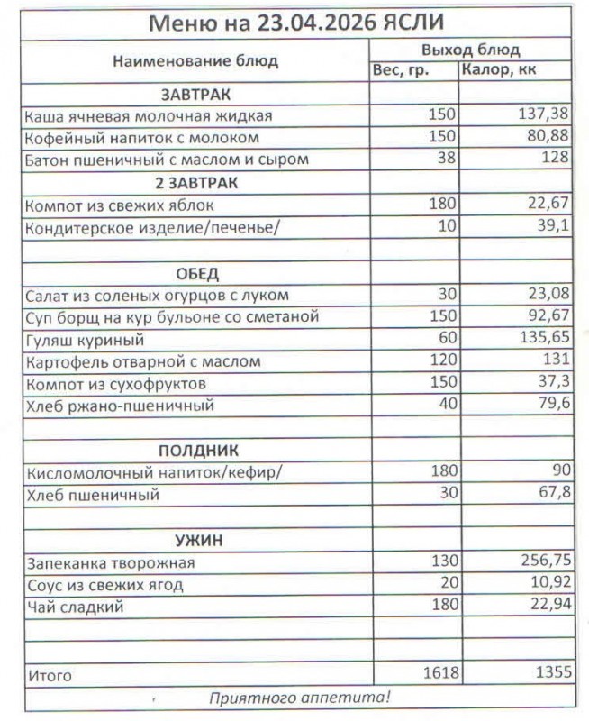 Меню на 23.04.2026 (ясли)