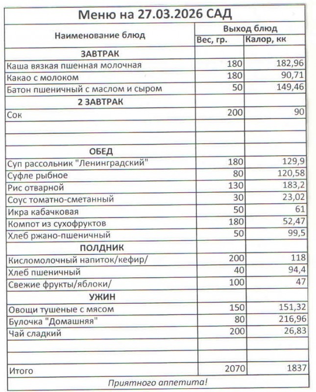 Меню на 27.03.2026 (сад)