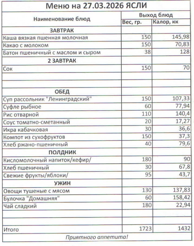 Меню на 27.03.2026 (ясли)