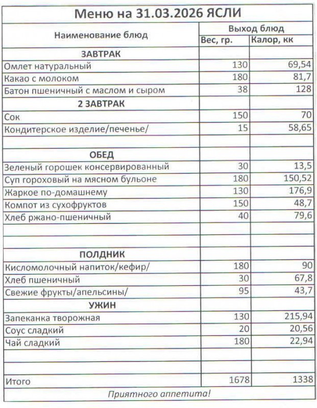 Меню на 31.03.2026(ясли)