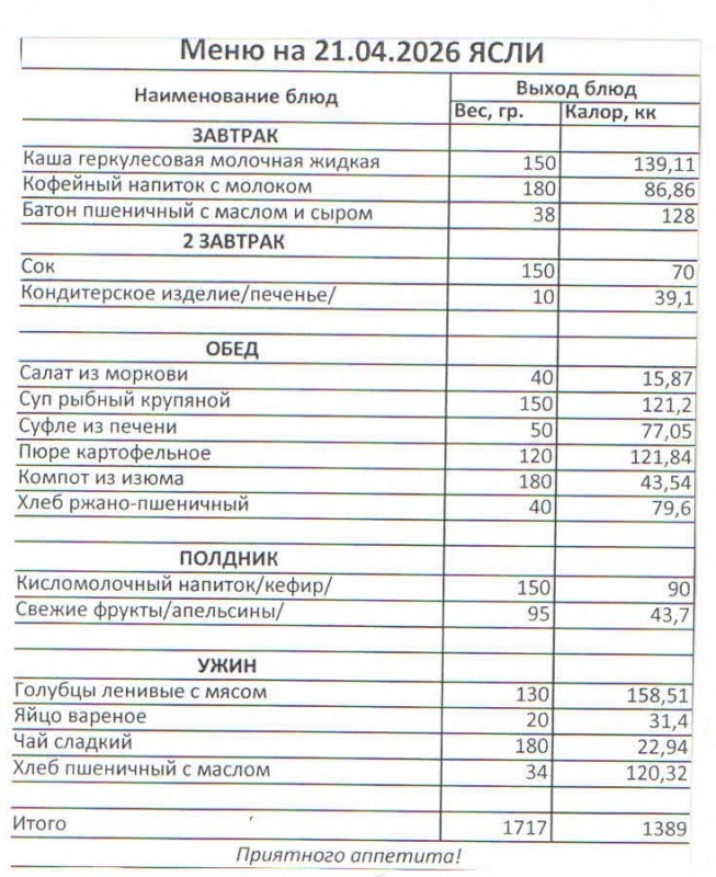 Меню на 21.04.2026 (ясли)