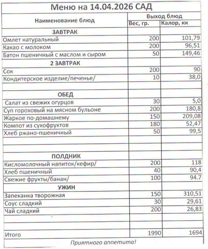 Меню на 14.04.2026 (сад)
